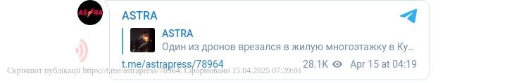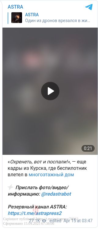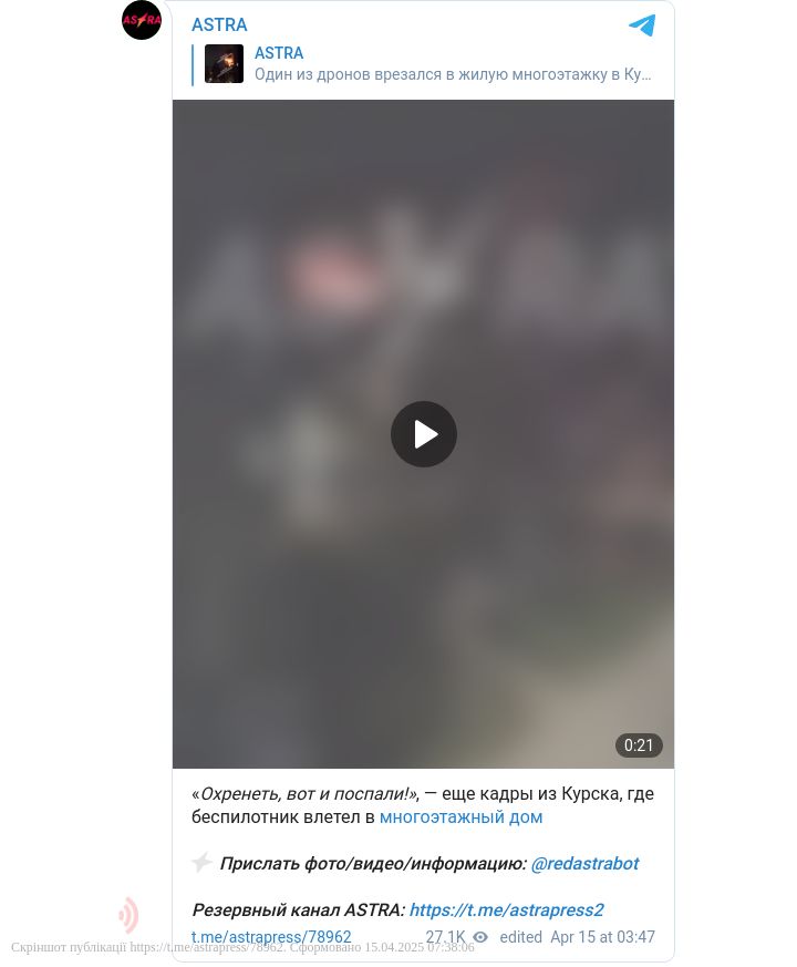 У ніч на 15 квітня дрони атакували Курськ, що у РФ. Один із дронів врізався у багатоповерхівку. Спалахнула пожежа. Повідомляють, що є загибла та поранені.