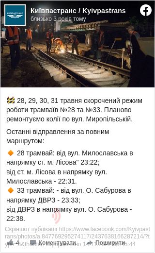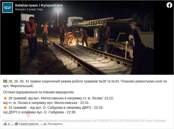 У Києві 28-31 травня триватиме скорочений режим роботи трамваїв №№ 28, 33.