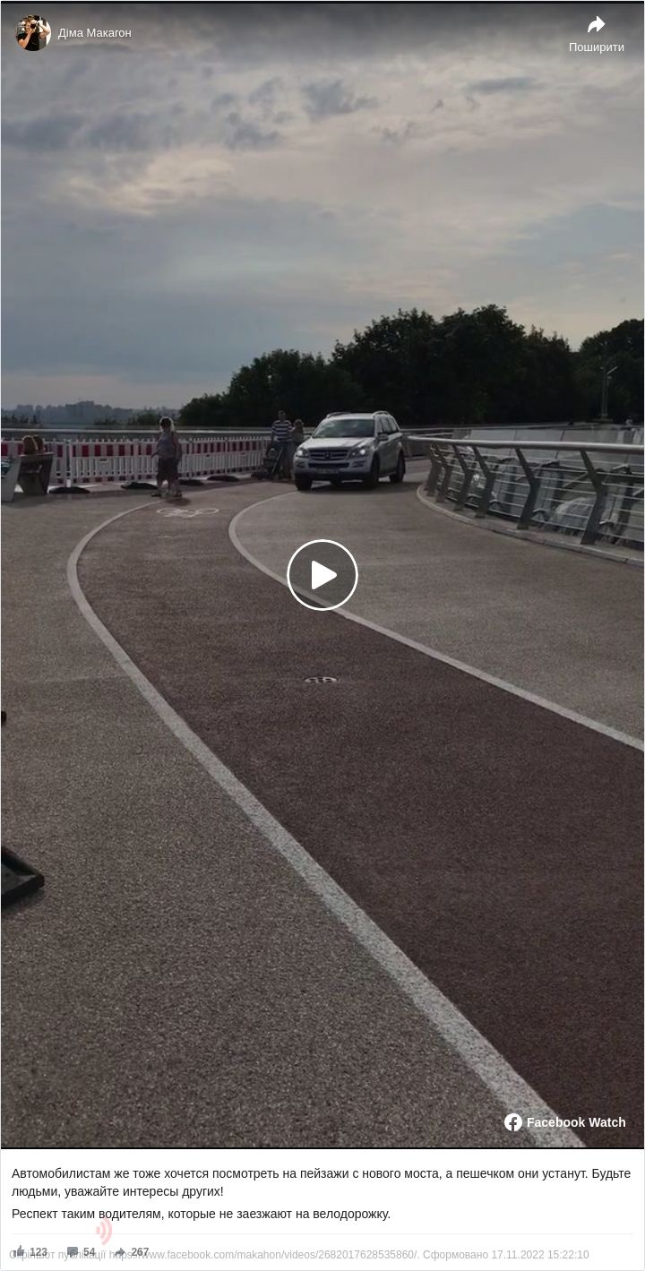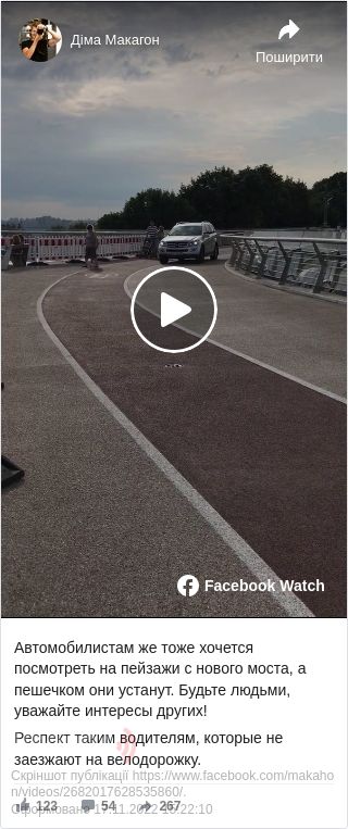 У понеділок, 17 червня, в мережі з'явилося фото, на якому видно, що на новий пішохідно-велосипедний міст, який у народі називають «мостом Кличка», заїхав автомобіль.