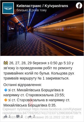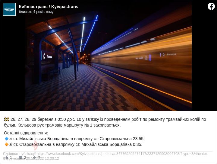 "26, 27, 28, 29 березня із 0:50 до 5:10 у зв’язку із проведенням робіт із ремонту трамвайних колій на б-рі Кольцова рух трамваїв маршруту № 1 закривається", - йдеться у повідомленні.