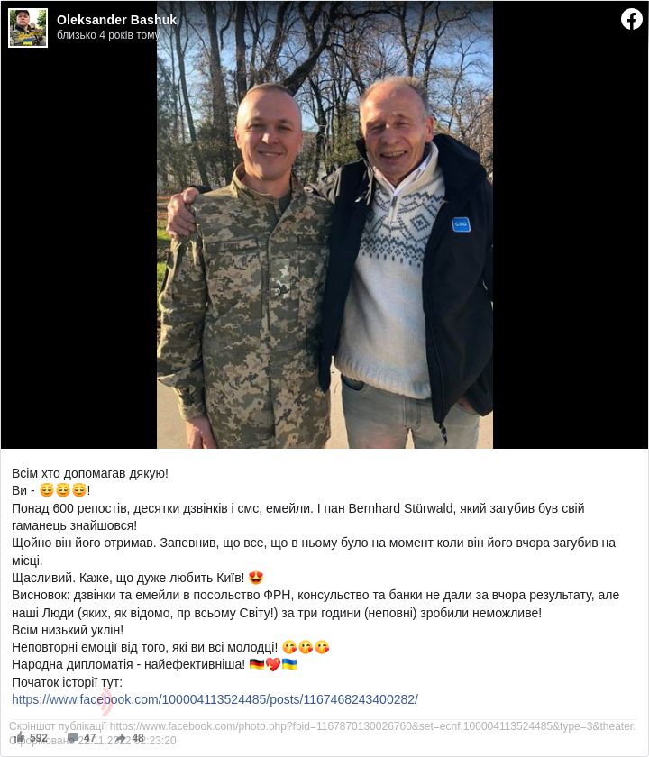 «Пройшло менше трьох годин! Пан Бернхард Штюрвальд знайшовся! Йому зателефонували з ФРН! Завдяки всім вам, друзі та Вашим зусиллям! Щиро всім дякую! Завтра я з ним зустрічаюсь та віддаю його майно!», - поділився радістю зі своїми підписниками учасник АТО.