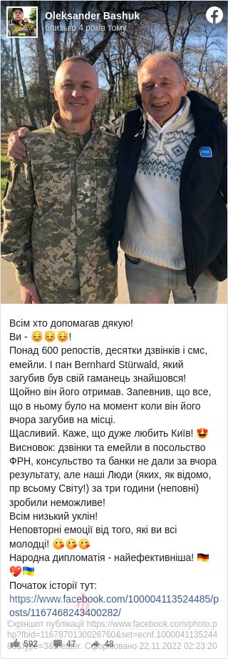 Наступоного дня Олександр зустрівся з власником гаманця та розповів про це на фейсбуці: «Всім хто допомагав дякую! Понад 600 репостів, десятки дзвінків і смс, емейли. І пан Bernhard Stürwald, який загубив був свій гаманець знайшовся! Щойно він його отримав. Запевнив, що все, що в ньому було на момент коли він його вчора загубив на місці. Щасливий. Каже, що дуже любить Київ!».