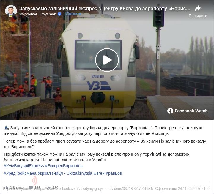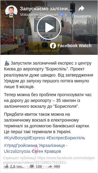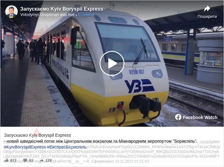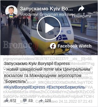 «У п’ятницю запускаємо залізничний експрес з центру Києва до аеропорту »Бориспіль«. Проект реалізували дуже швидко. Від затвердження урядом до запуску першого потяга минуло — лише дев'ять місяців», — зазначив Гройсман.