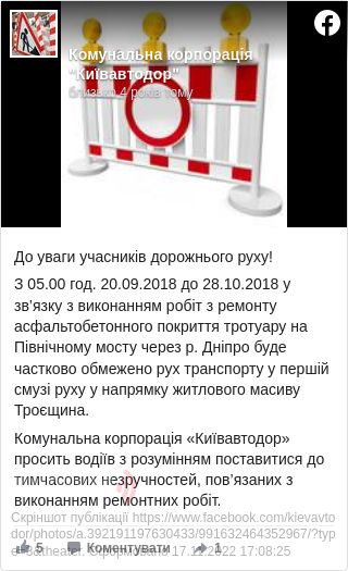 "З 5:00 20 вересня до 28 жовтня в зв'язку з ремонтом асфальтобетонного покриття тротуару на Північному мосту через р. Дніпро буде частково обмежено рух транспорту в першій смузі руху в напрямку житлового масиву Троєщина", - йдеться в повідомленні на сторінці Департаменту транспортної інфраструктури КМДА в Фейсбук в середу.