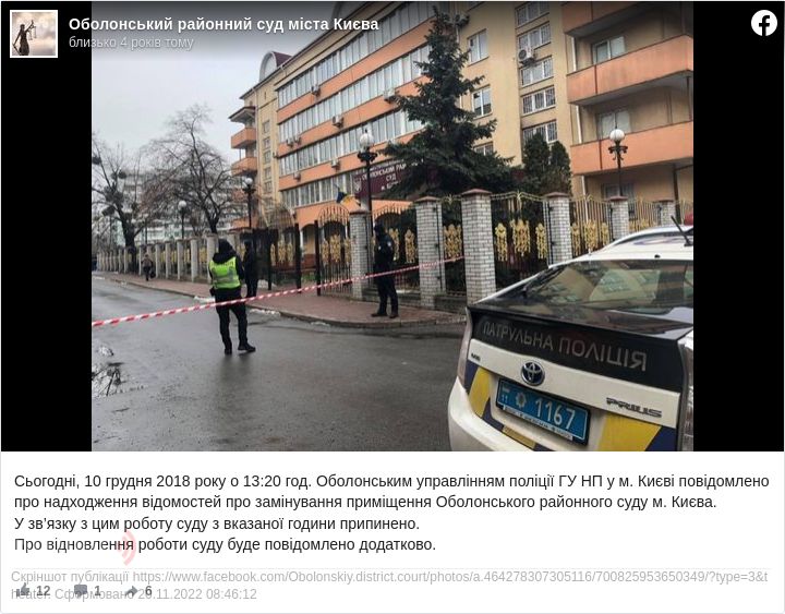 У Києві робота Оболонського та Шевченківського районних судів призупинена в понеділок, 10 грудня, після повідомлень про мінування.