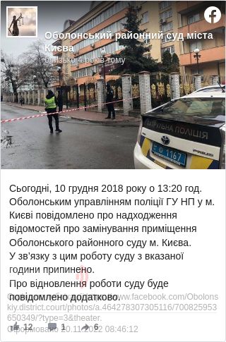 "У зв'язку з цим призупинено роботу суду. Зараз проводиться евакуація співробітників і відвідувачів суду. Про відновлення роботи суду буде повідомлено додатково", — йдеться на сторінці Шевченківського суду в соцмережі.