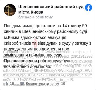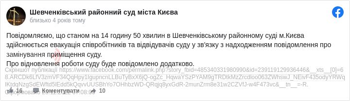 «Повідомляємо, що станом на 14 годин 50 хвилин в Шевченківському районному суді Києва здійснюється евакуація співробітників і відвідувачів суду у зв'язку з надходженням повідомлення про мінування будівлі суду», — йдеться в повідомленні.