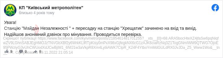 "Увага! Станцію "Майдан Незалежності " + пересадку на станцію "Хрещатик" зачинено на вхід та вихід. Надійшов анонімний дзвінок про мінування. Проводиться перевірка", - зазначили в прес-службі.