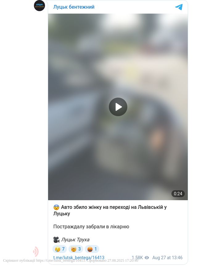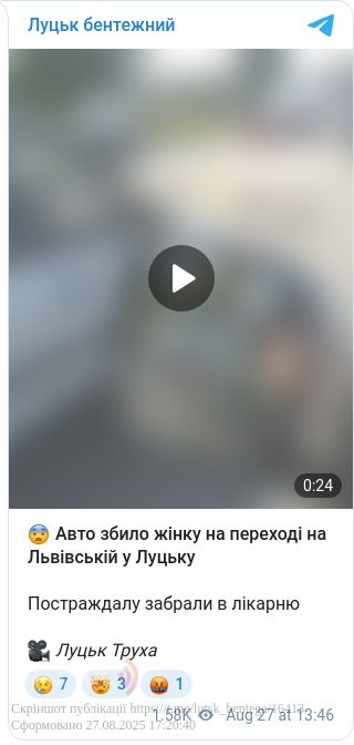 У середу, 27 серпня, в Луцьку на вулиці Львівській сталася дорожньо-транспортна пригода – водій легковика збив жінку.