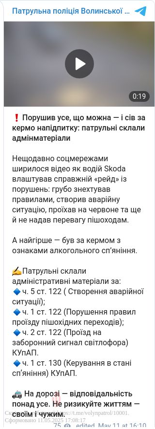 У Луцьку патрульні склали адмінматеріали на п'яного водія Skoda, який створив загрозливу ситуацію на дорозі.