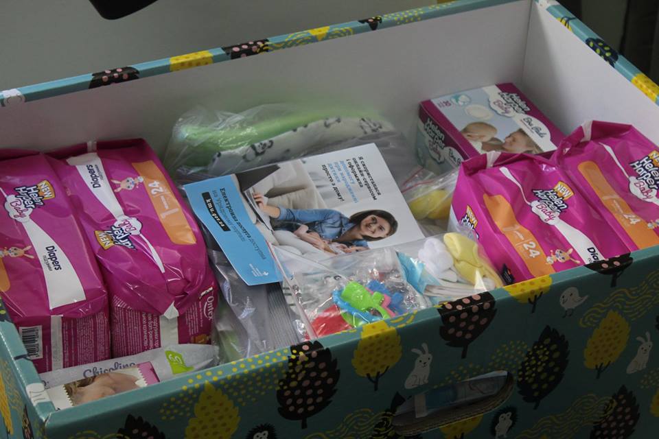 У бейбі-боксі є підгузки, бавовняні шапочки, термометри, повзунки, ковдра та інші необхідні для дітей речі.