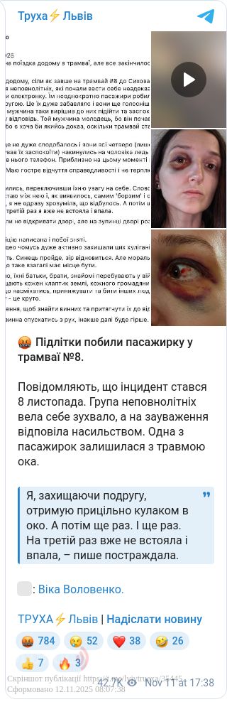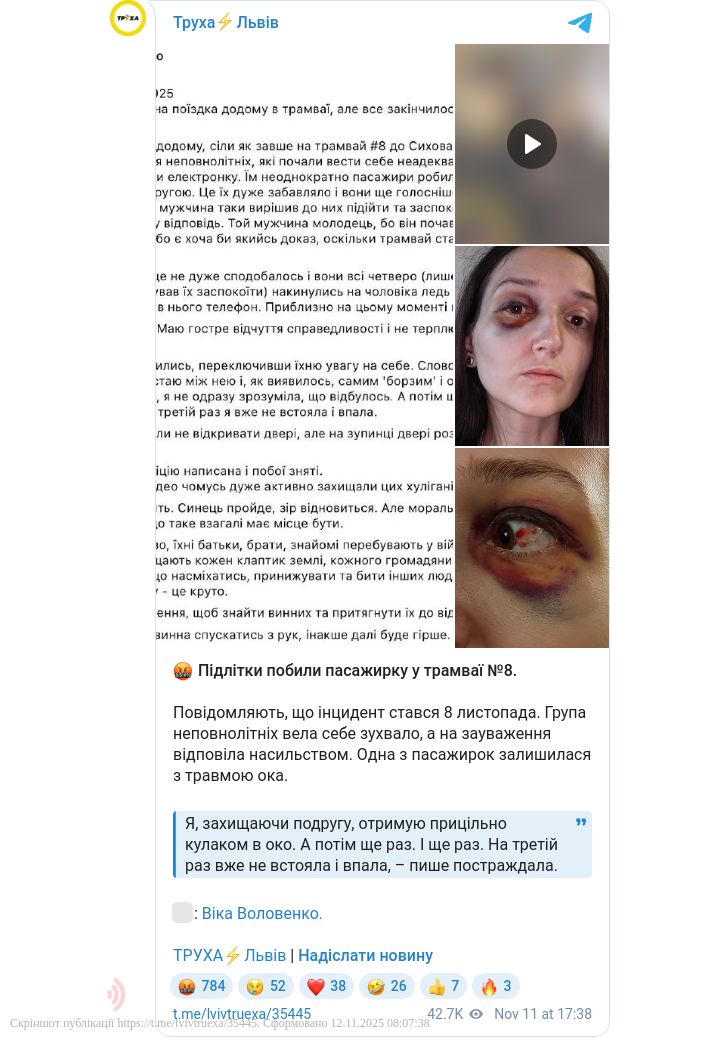 Раніше у місцевих пабліках з'явилось відео конфлікту у трамваї між підлітками та іншими пасажирами. Згодом жінка опублікувала наслідки побиття, а також поділилась подробицями інциденту.