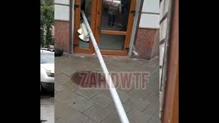 Стовп завалився. Частина стовпа пробила скло у пластикових вхідних дверях якогось закладу на першому поверсі. Про потерпілих не повідомляється.