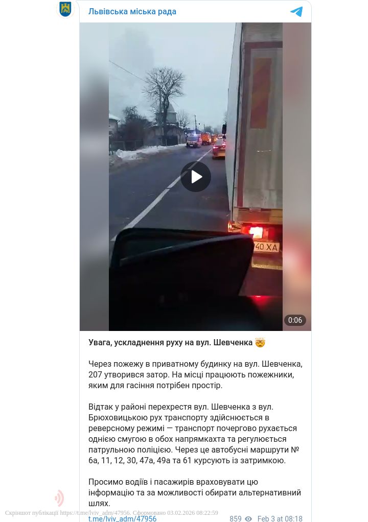 Зранку 3 лютого через ліквідацію пожежі у приватному будинку на вулиці Шевченка, 207, у Львові виникли значні проблеми з транспортним сполученням.