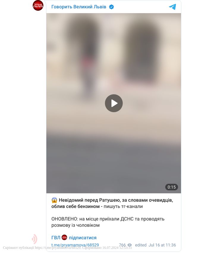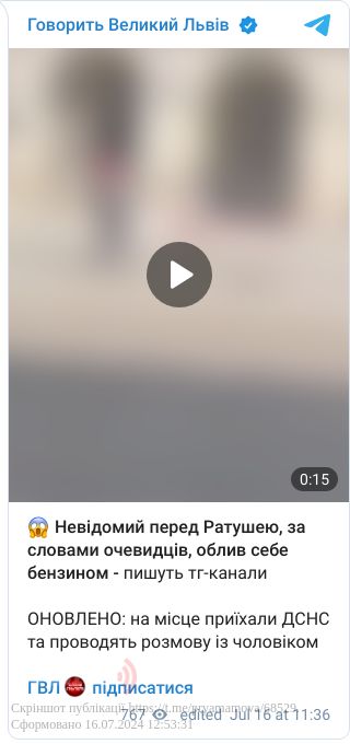 Невідомий перед львівською Ратушею сьогодні, 16 липня, за словами очевидців, облив себе бензином.