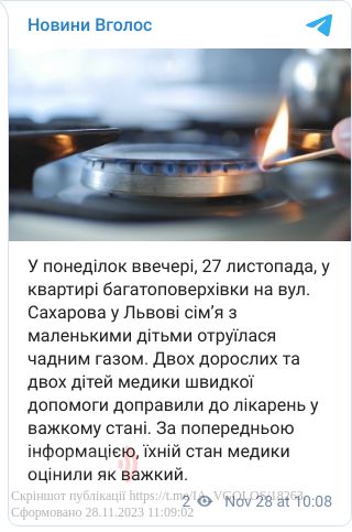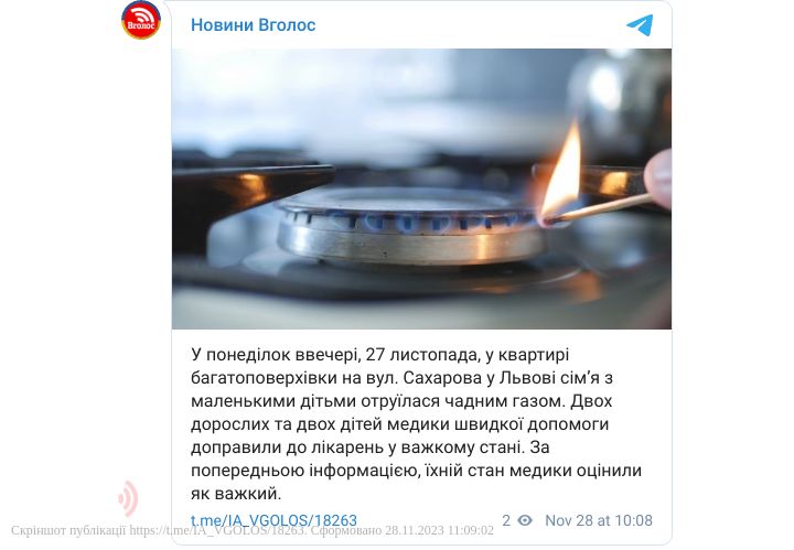 У понеділок ввечері, 27 листопада, у квартирі багатоповерхівки на вул. Сахарова у Львові сім’я з маленькими дітьми отруїлася чадним газом. Двох дорослих та двох дітей медики швидкої допомоги доправили до лікарень у важкому стані.