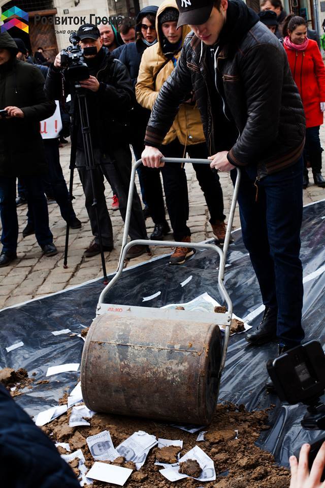 "На завершення акції відбулось театралізоване представлення того, як, на нашу думку, за рахунок міського бюджету вирішуються проблеми у місті — "закатали гроші у болото"! Представники ГО "Розвиток громади" прибрали все сміття та болото, що використали під час пікету! До акції долучились: ГО "Розвиток громади", ГО "Народна дія", ГО "Українська спілка учасників АТО", ГО "Ветеранське братерство", ГО "Львівська обласна спілка соціального захисту бійців АТО та сімей загиблих", "Правий сектор Львівщини", ГО "Рабів до раю не впускають", ГО "Об’єднання добровольців", ГО "Побратими об’єднанні", мешканці вулиць Тернопільска, Технічна, Каменярів, Ференца Ліста, Вороного, Малоголосківська, мікрорайону "Під Голоском", а також просто небайдужі жителі міста", — йдеться у повідомленні.