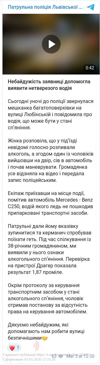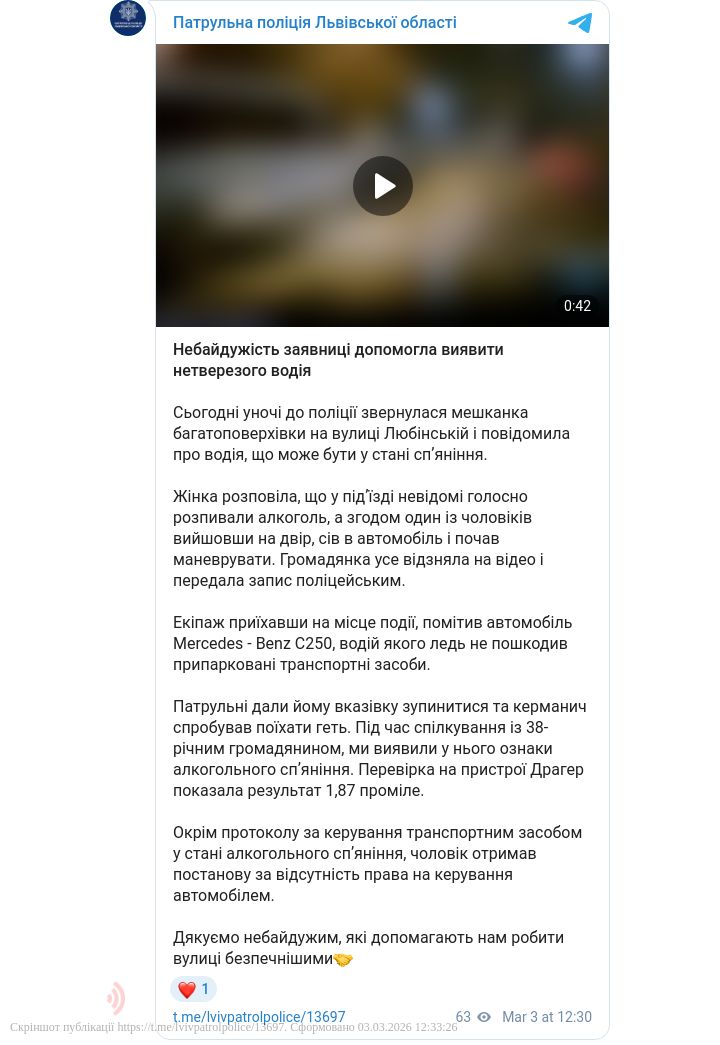 Про це повідомляє патрульна поліція Львівської області. Порушника вдалося виявити завдяки пильності місцевої мешканки, яка зафіксувала небезпечні дії чоловіка на відео.