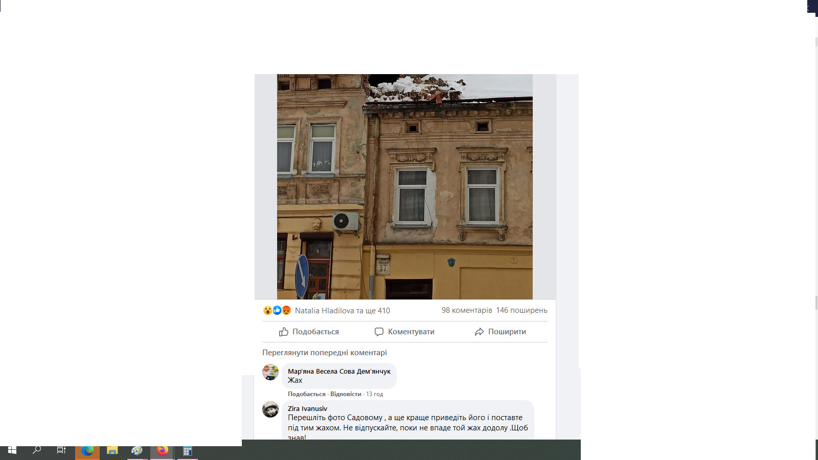 Користувач соцмережі Тарас Кінах запостив фото будинку, з даху якого разом із снігом та льодом звисає цегла, що може у будь-який час впасти на людей, що проходять по вулиці Джерельна, 57, що неподалік центру Львова. Свій пост чоловік розмістив у групі гаряча лінія міста Львова.