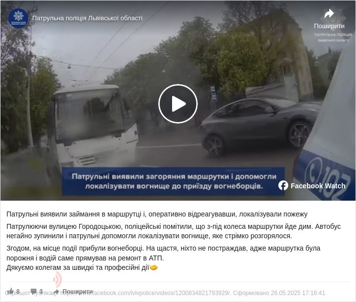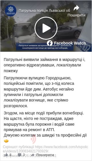 Патрулюючи вулицею Городоцькою, поліцейські помітили, що з-під колеса маршрутки йде дим. Автобус негайно зупинили і патрульні допомогли локалізувати вогнище, яке стрімко розгорялося.