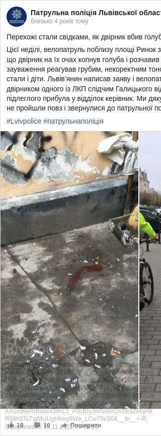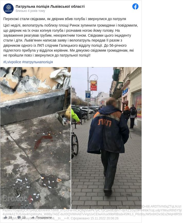 Львів'яни побачили, як працівник комунального підприємства жорстоко вбив голуба та звернулися по допомогу до поліцейських.