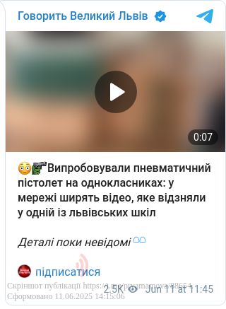 Сьогодні, 11 червня, під час моніторингу соціальних мереж поліцейські виявили публікацію з відео, на якому неповнолітній хлопець здійснив постріл з невідомої зброї в у напрямку свого однокласника в шкільному кабінеті.