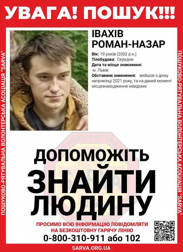 Так, Роман-Назар Івахів вийшов з дому близько місяця тому і не повернувся. Після цього його місцеперебування невідоме.