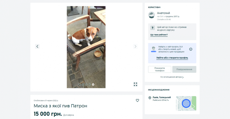«Миска з кафе, в якому перебував Патрон зі своєю сім'єю у Львові, гроші підуть на підтримку ЗСУ. Тільки дзвінки. Продаж за дозволом власників», - йдеться в оголошенні.