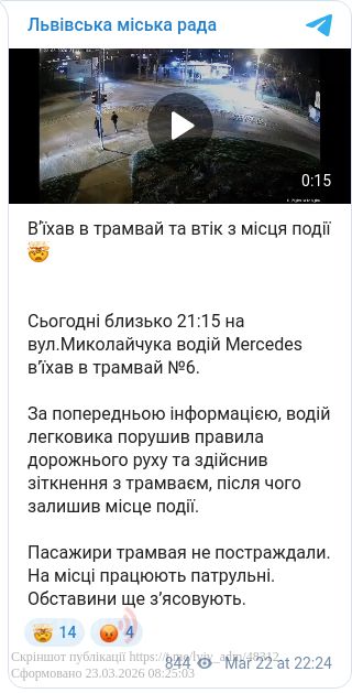 ДТП трапилася сьогодні, 22 березня, близько 21:15. Водій автомобіля Mercedes, рухаючись по вулиці Миколайчука, здійснив зіткнення з трамваєм, що курсував за маршрутом №6. За попередніми даними, причиною аварії стало грубе порушення правил дорожнього руху з боку водія легковика.