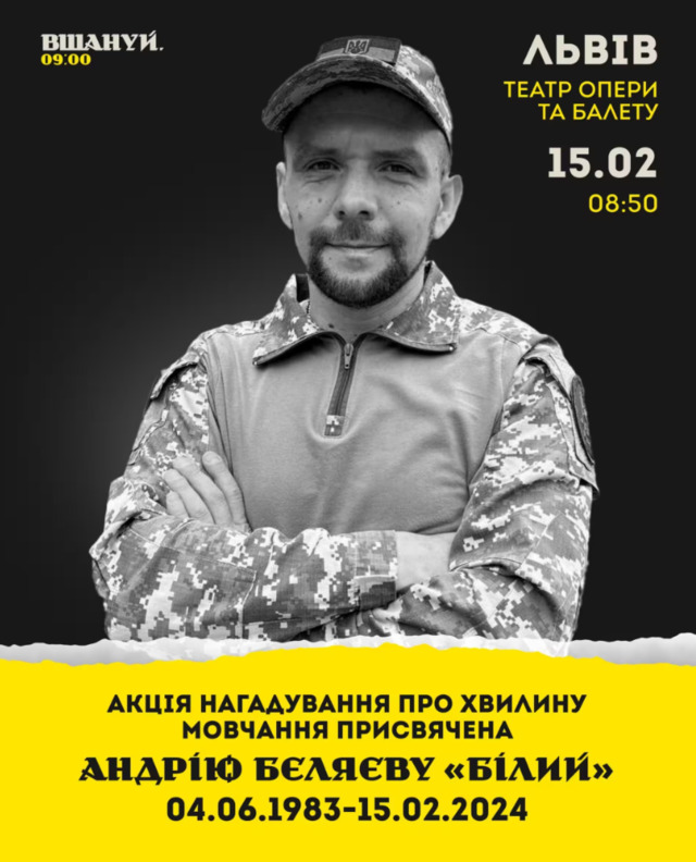 Вшанування пам'яті Андрія Бєляєва відбудеться завтра о 9:00 у центрі Львова. Громада збирається біля будівлі Львівського національного академічного театру опери та балету імені Соломії Крушельницької, що розташований на проспекті Свободи, 28.