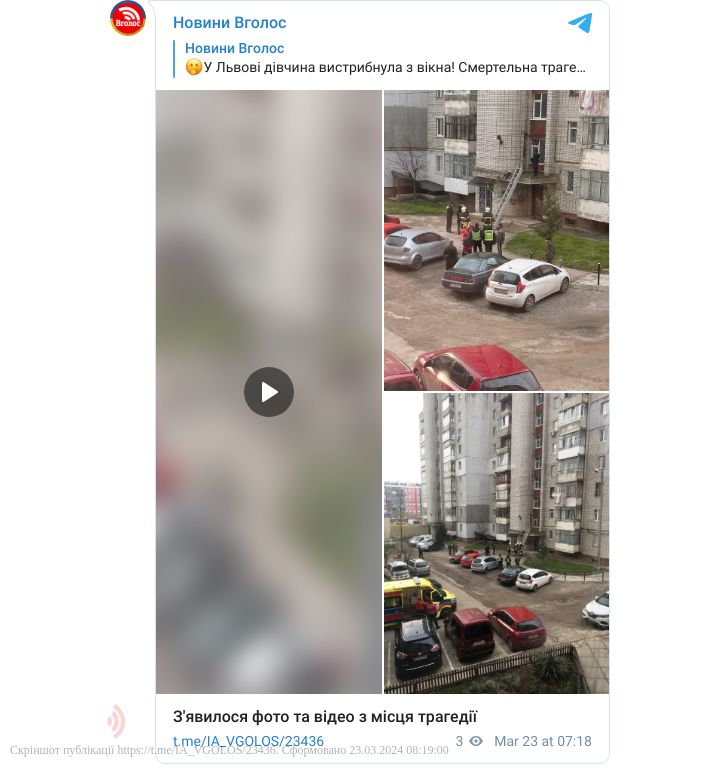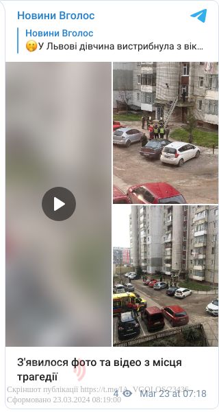 Сьогодні, 23 березня, у Львові на вулиці Б. Хмельницького 275, дівчина випала з вікна.