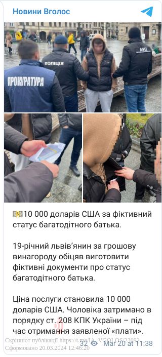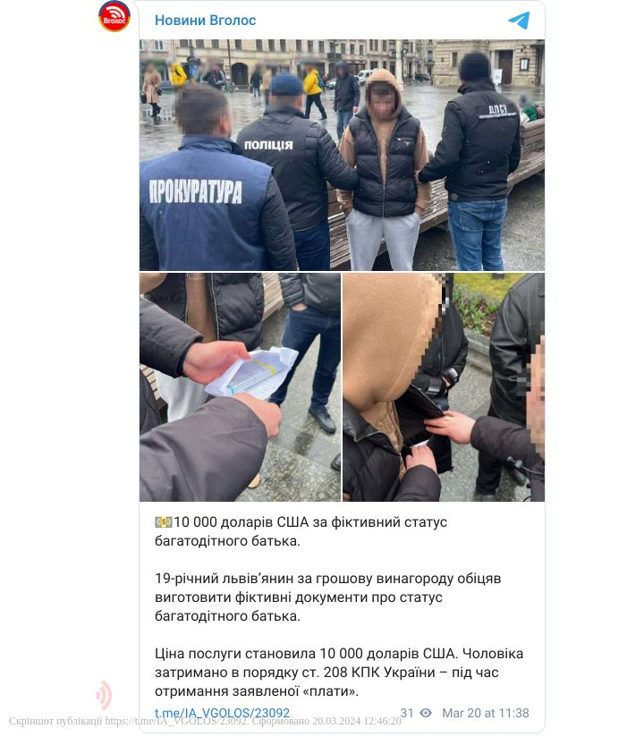 19-річного львів'янина підозрюють у незаконному переправленні військовозобов'язаних за кордон. За 10 тисяч доларів юнак обіцяв «клієнту» виготовити фіктивні документи про статус багатодітного батька.