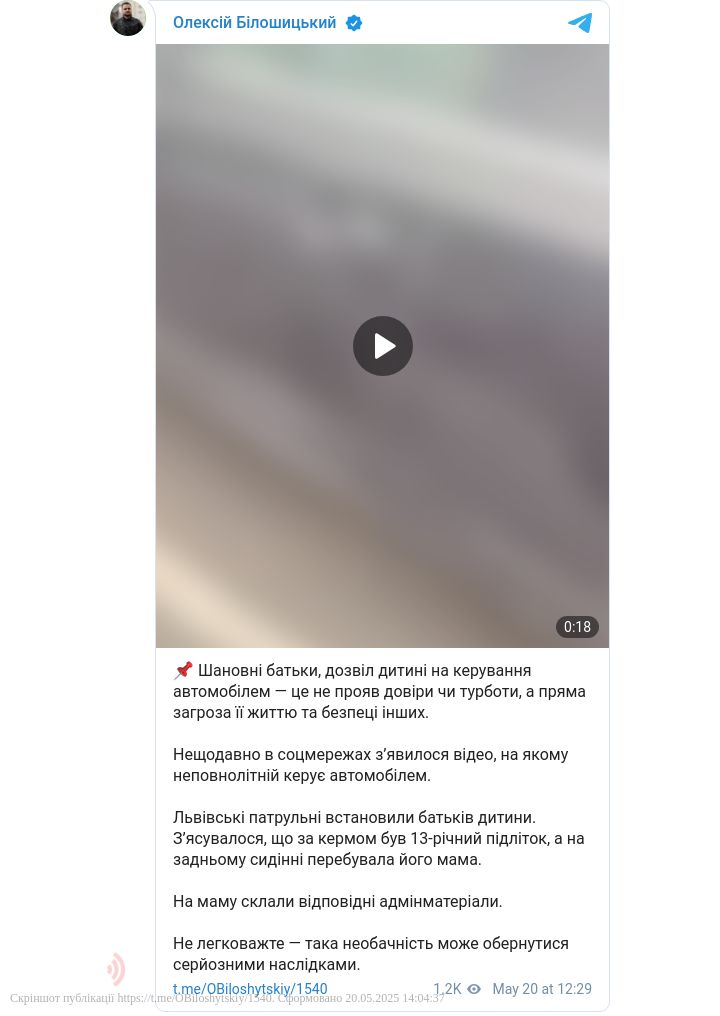 «Шановні батьки, дозвіл дитині на керування автомобілем — це не прояв довіри чи турботи, а пряма загроза її життю та безпеці інших. На маму склали відповідні адмінматеріали. Не легковажте — така необачність може обернутися серйозними наслідками», — зазначив Олексій Білошицький.