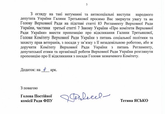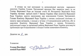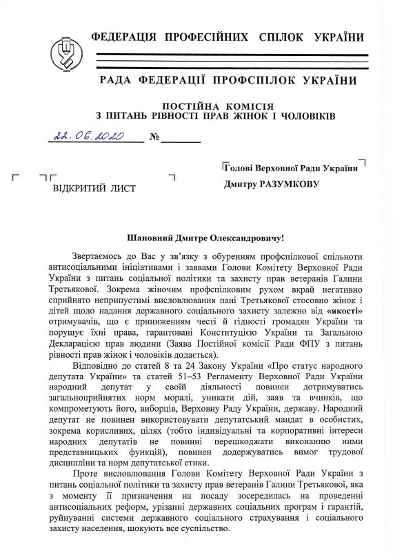 Нардеп від «Слуги народу» та очільниця Комітету ВРУ з питань соціальної політики Галина Третьякова заявила, що у сім'ях, які потребують матеріальної допомоги, народжуються діти «дуже низької якості». Після цього у Раді Федерації профспілок зажадали відставки Третьякової.