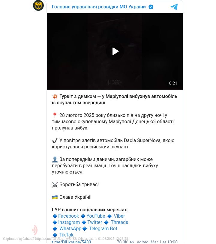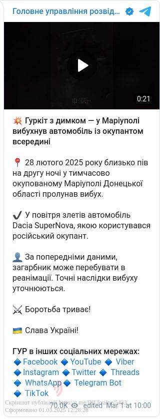 У тимчасово окупованому Маріуполі Донецької області пролунав вибух, у повітря злетів автомобіль Dacia SuperNova, яким користувався російський окупант.