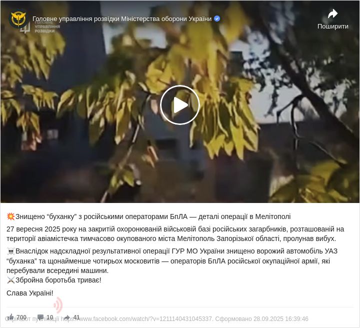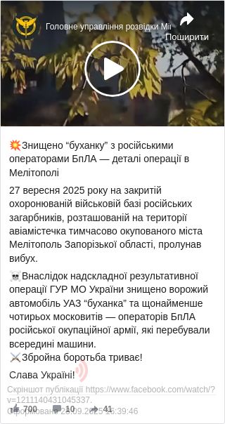 «Внаслідок надскладної результативної операції ГУР МО України знищено ворожий автомобіль УАЗ »буханка« та щонайменше чотирьох московитів ― операторів БпЛА російської окупаційної армії, які перебували всередині машини», ― додали у розвідці.