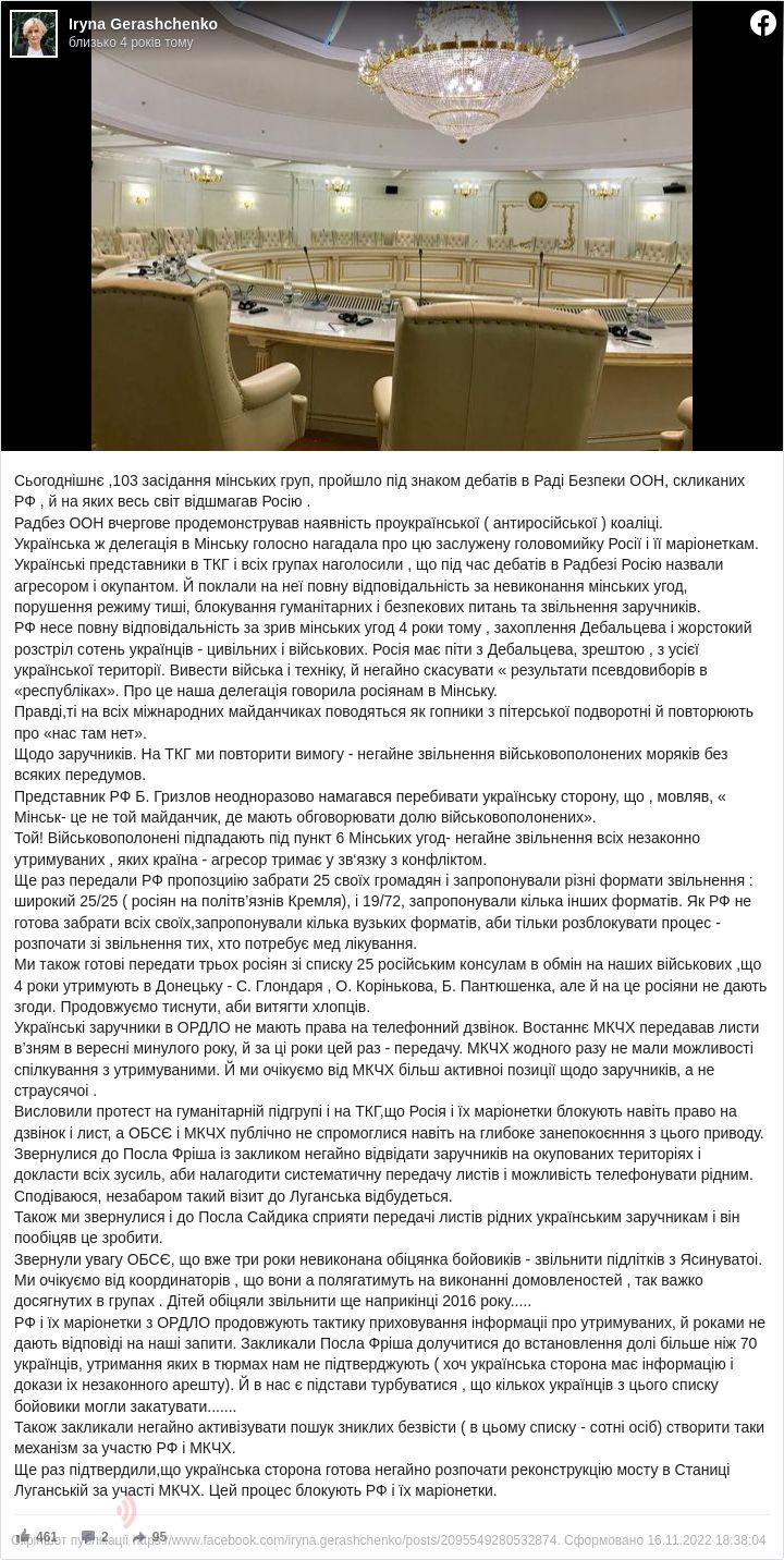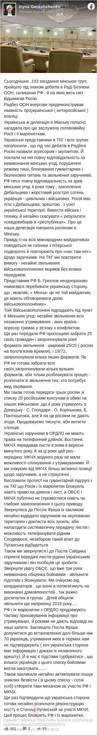 "На ТКГ ми повторили вимогу – негайне звільнення військовополонених моряків, без всяких передумов. Представник РФ Б. Гризлов неодноразово намагався перебивати українську сторону, що, мовляв, "Мінськ - це не той майданчик, де повинні обговорювати долю військовополонених". Та! Військовополонені підпадають під пункт 6 Мінських угоду – негайне звільнення всіх незаконно утримуваних, кого країна-агресор утримує в зв'язку з конфліктом", – написала Геращенко.