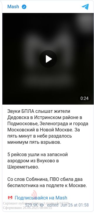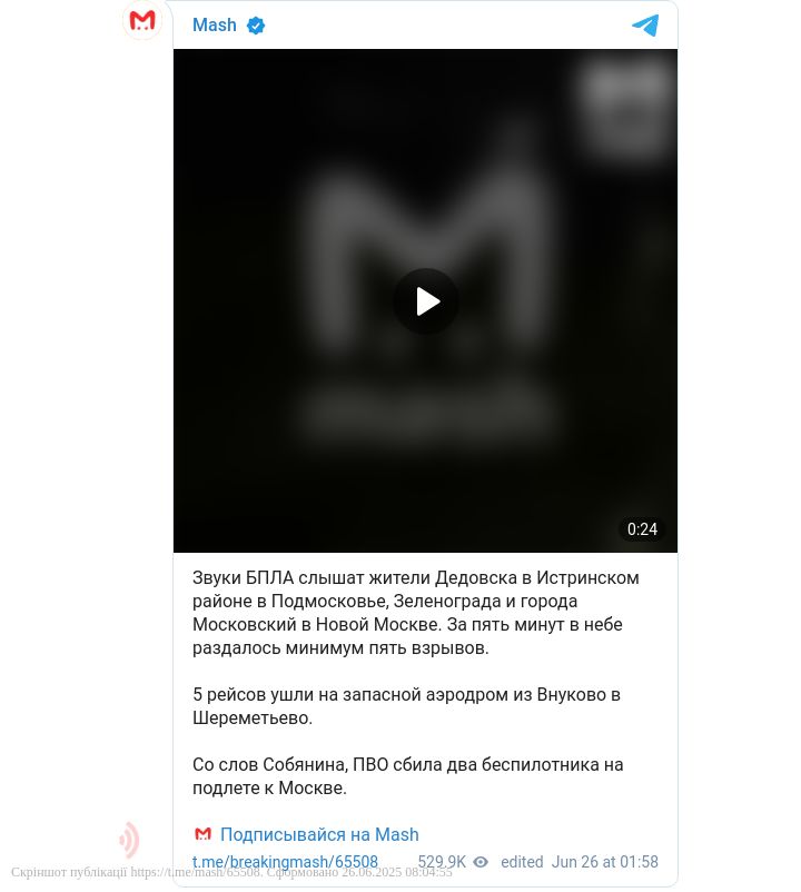 У ніч на 26 червня у Підмосков'ї прогриміла потужна серія вибухів, а мер Москви Сергій Собянін повідомив, що російська ППО збила декілька дронів, що летіли на столицю РФ.