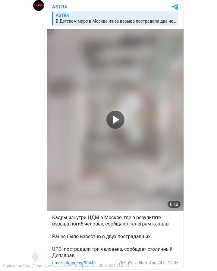 У неділю, 24 серпня, у центрі Москви стався потужний вибух у магазині іграшок «Центральний дитячий магазин» на Луб’янській площі, поряд із будівлею ФСБ Росії.