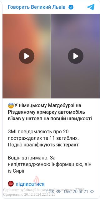 У німецькому місті Магдебург автомобіль в'їхав у натовп на Різдвяному ярмарку. Унаслідок події багато постраждалих.