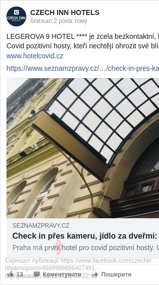 Про це у Facebook повідомила компанія Czech Inn Hotels, якій належить цей готель.
