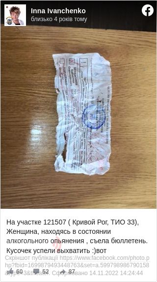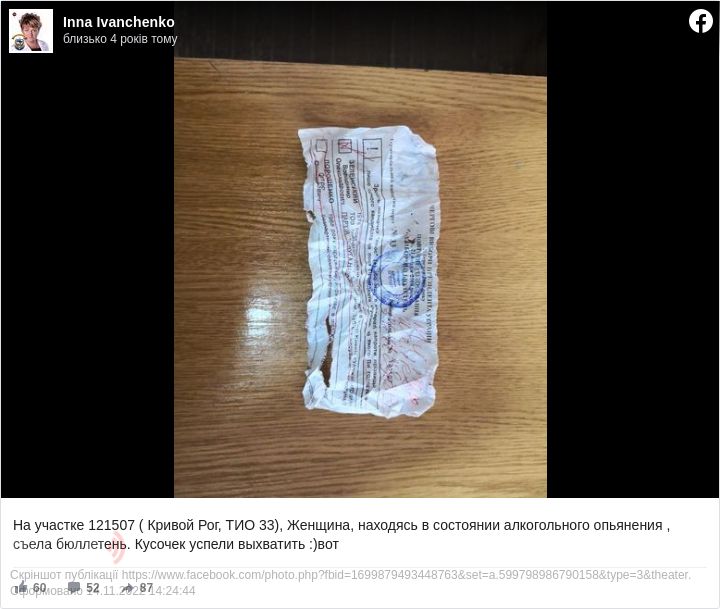 «Жінка, перебуваючи в стані алкогольного сп'яніння, з'їла бюлетень. Шматочок встигли вихопити», — написала вона у Facebook.