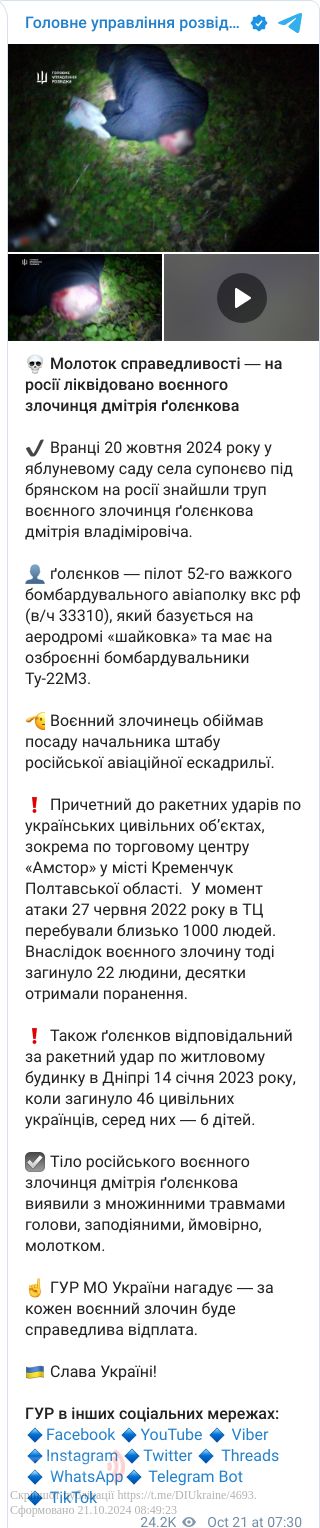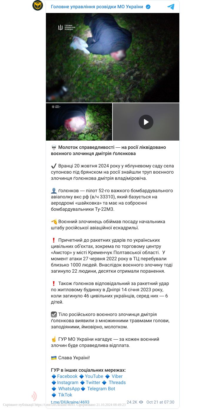 20 жовтня 2024 року у селі Супонєво під Брянском РФ)знайшли труп воєнного злочинця Голєнкова Дмітрія Владіміровіча.