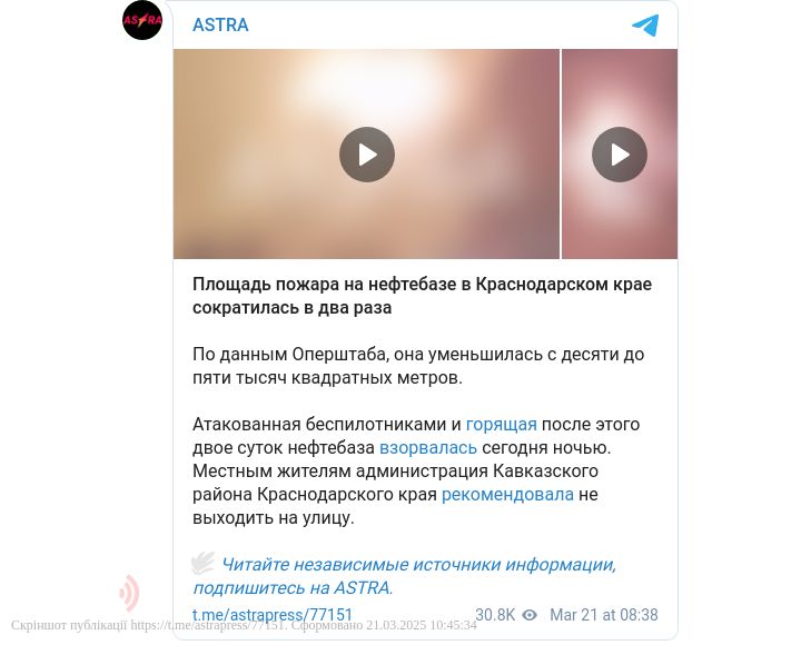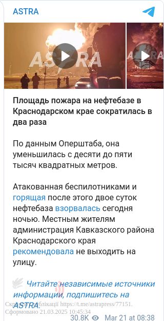 Нафтоперевалочний пункт «Кавказька», розташований у Краснодарському краї Росії, вже третю добу залишається охопленим вогнем після атаки, яка сталася в ніч на 19 березня.