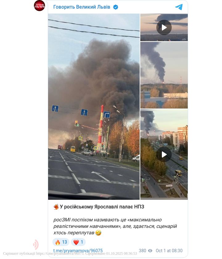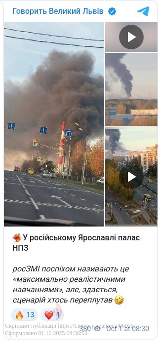 Вранці 1 жовтня у російському Ярославлі сталася масштабна пожежа на території нафтопереробного заводу. Чорний стовп диму було видно за кілька кілометрів від місця події.