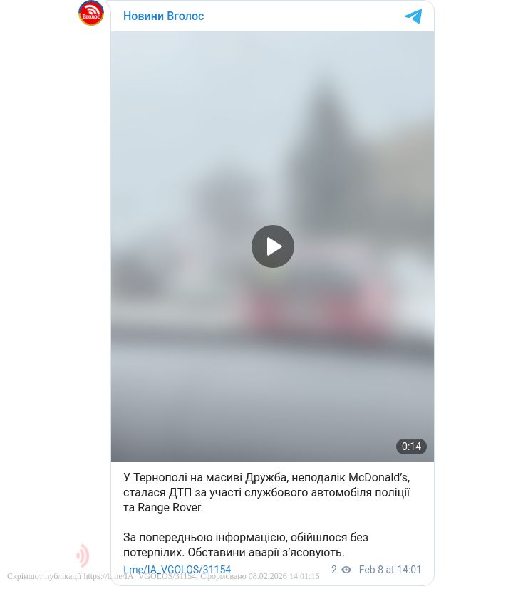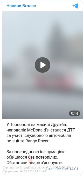 У Тернополі на масиві Дружба, неподалік McDonald’s, сталася ДТП за участі службового автомобіля поліції та Range Rover.