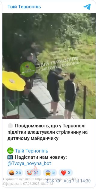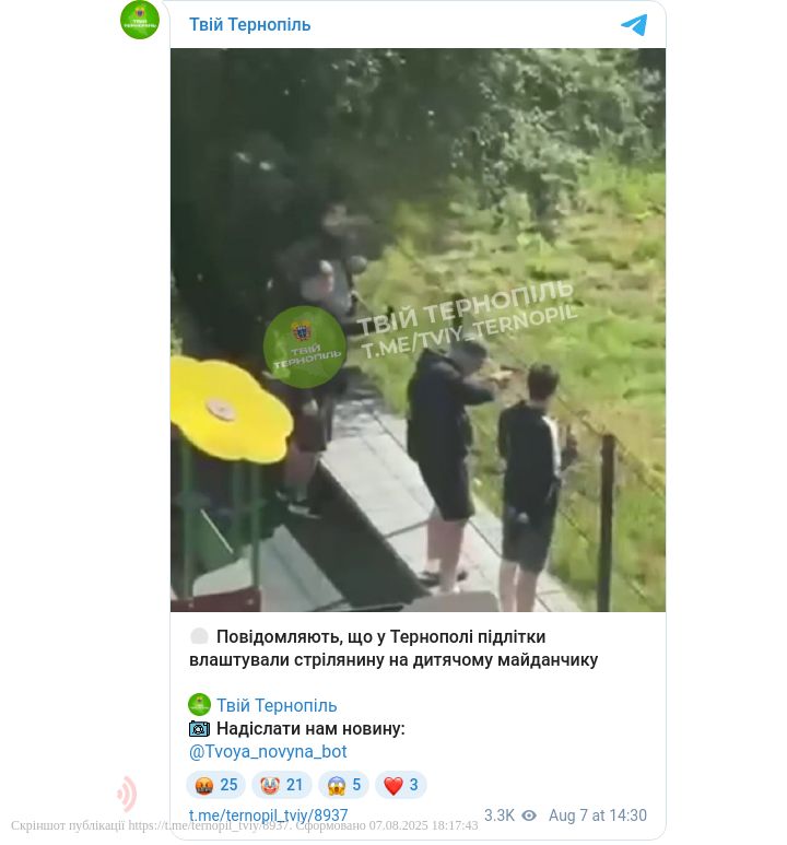 У четвер, 7 серпня, у соцмережах з’явилася публікація про те, що невідомі стріляли з невстановленої зброї поблизу дитячого майданчика
