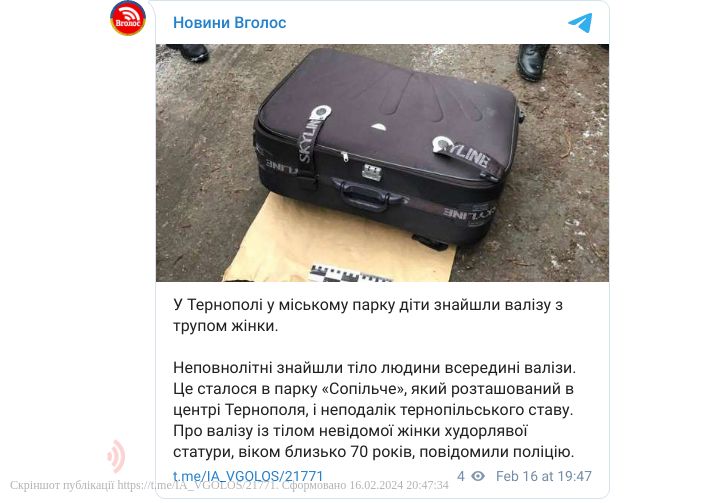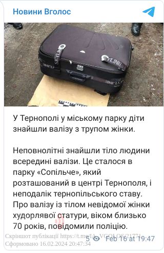 Неповнолітні знайшли тіло людини всередині валізи. Це сталося в парку «Сопільче», який розташований в центрі Тернополя, і неподалік тернопільського ставу. Про валізу із тілом невідомої жінки худорлявої статури, віком близько 70 років, повідомили поліцію. В поліції зазначили, що тіло не розчленоване.