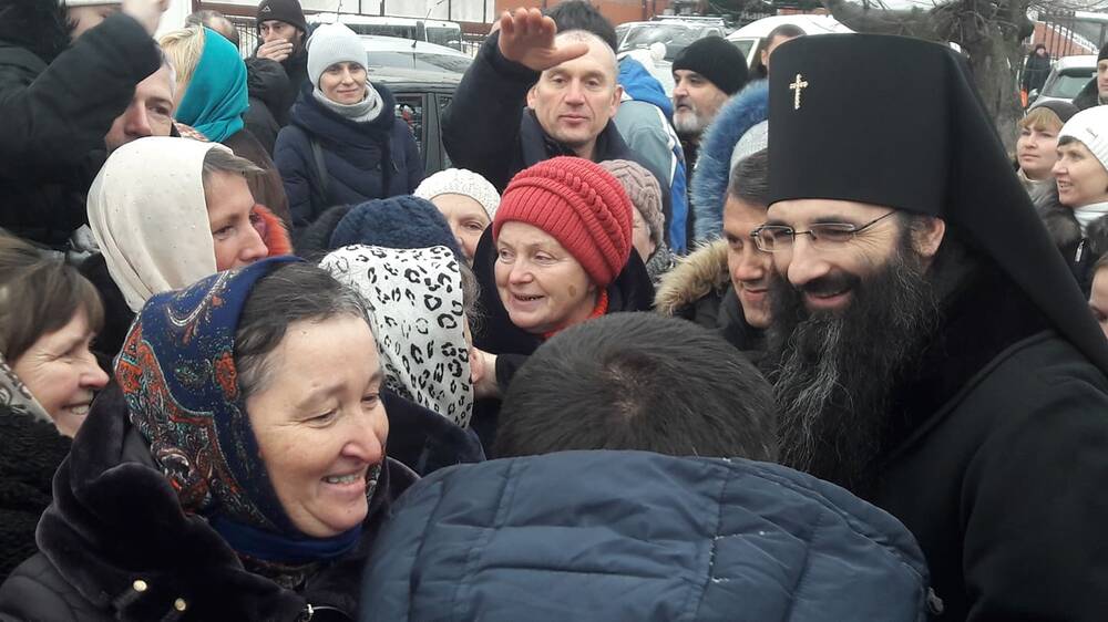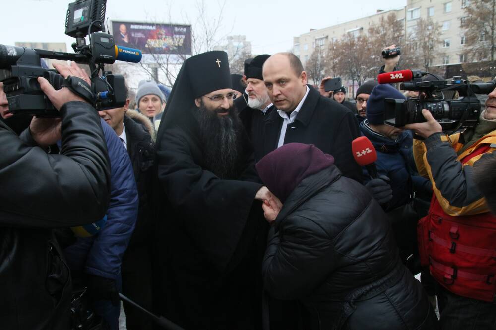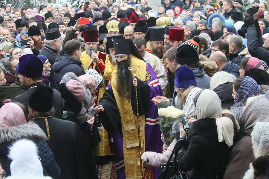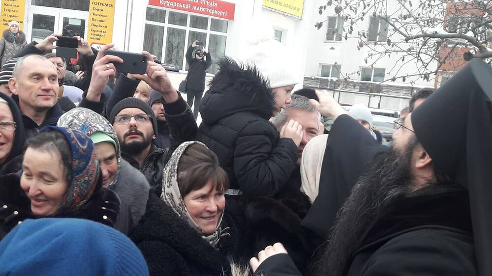 Вірні МП ставали перед московським попом на коліна, штовхалися між собою, щоб поцілувати руку Варсофонію.