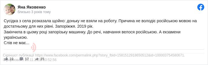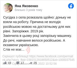 «Сусідка із села розказала щойно: доньку не взяли на роботу. Причина: не володіє російською мовою на достатньому для них рівні. Запоріжжя. 2019 рік», - зазначила вона.